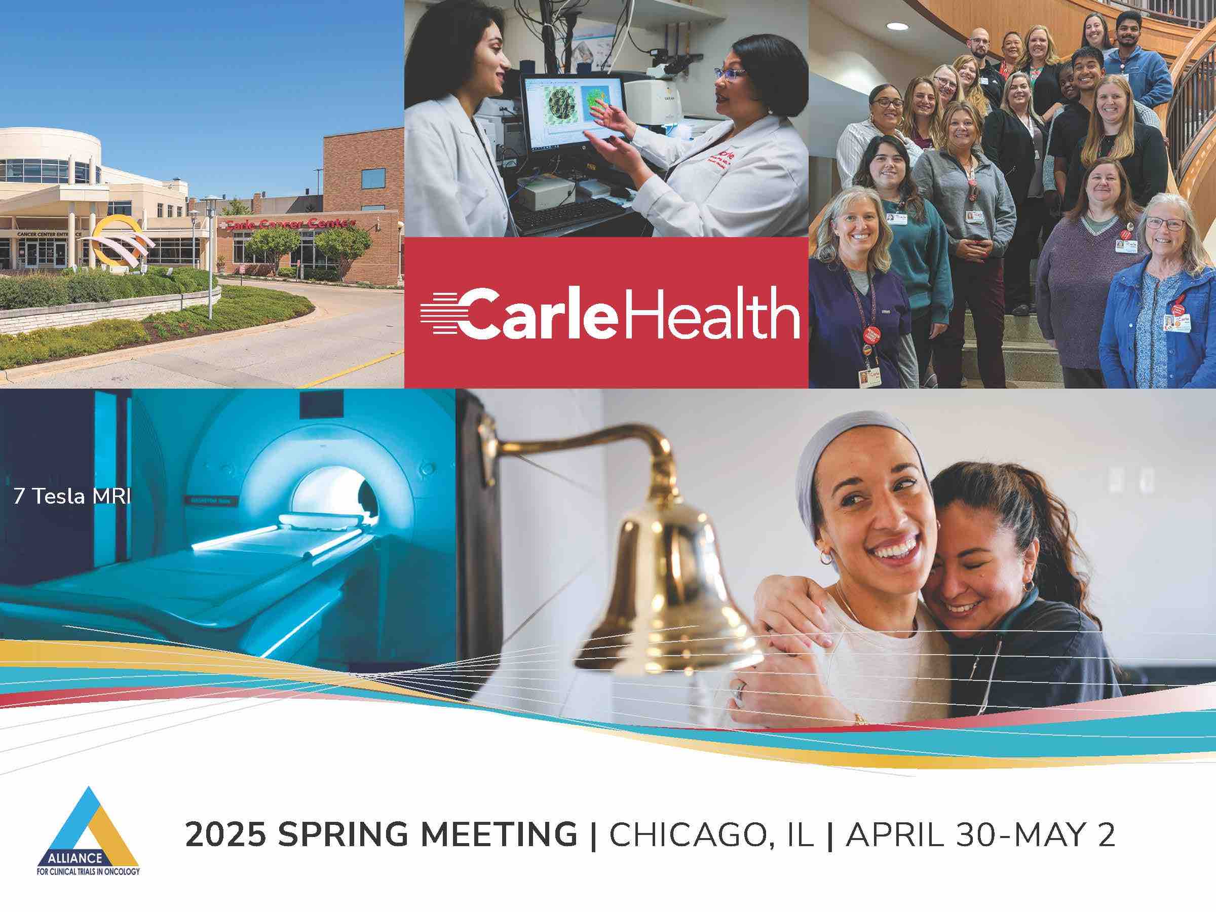 Congratulations to the Carle Cancer Center NCI Community Oncology Research Program for the 2025 Alliance Spring Group Meeting Book cover design. For more than 40 years, Carle Cancer Center has been advancing medicine by providing patients access to a wide range of treatment options, including high-quality clinical trials. Carle has participated in more than 800 clinical trials, enrolling more than 6,500 patients. Kendrith Rowland, MD, serves as the site principal investigator for Carle-NCORP Alliance trials, and Betsy Barnick, MHS, CCRP, is the Manager of Oncology Research. Click here to download and view the meeting book located on the Alliance member website.